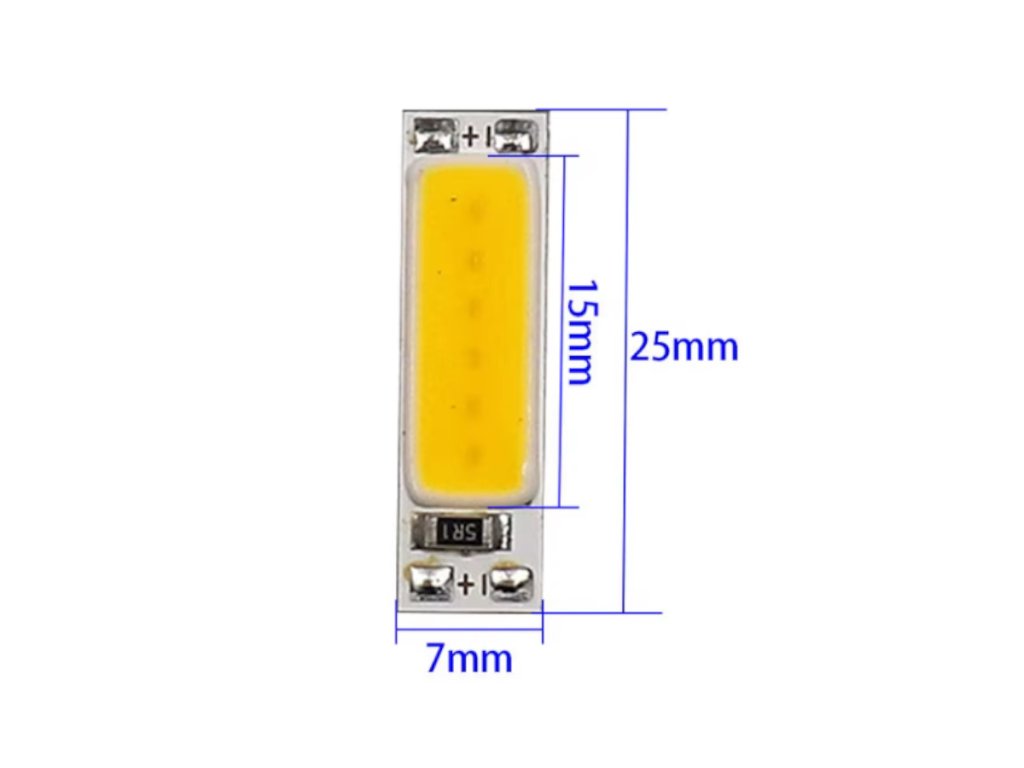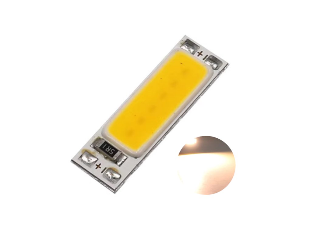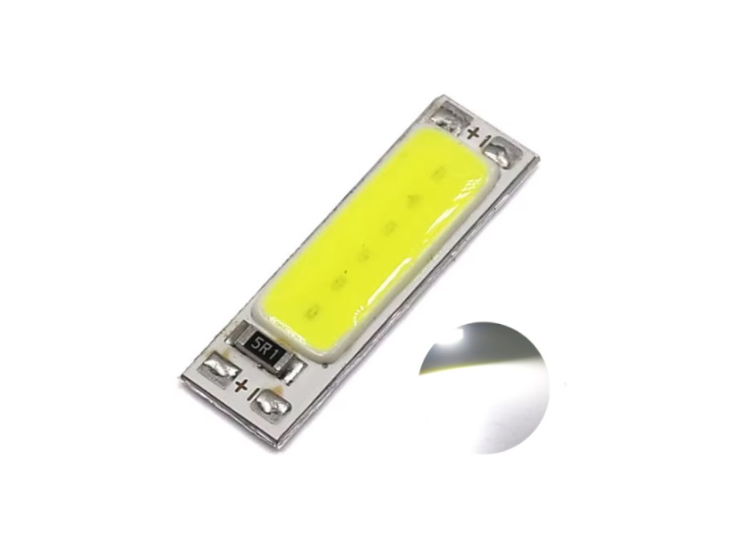 Az 1W-os COB LED Chip egy kisméretű (25x7 mm), rendkívül sokoldalú fényforrás, amely ideális alacsony feszültségű, hordozható és DIY világítási projektekhez. Alacsony, 3-5V DC bemeneti feszültsége miatt tökéletesen alkalmas 3V-os elemekkel vagy 3.7V-os Li-ion akkumulátorral való használatra. 110 LM/W fényhasznosítása mellett választható hideg vagy meleg fehér fénnyel.