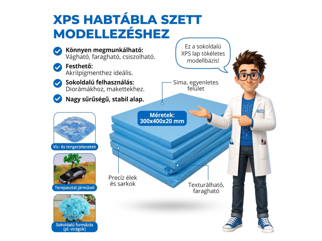 Ez a kék dioráma hablap kiváló alapanyag makettezéshez, terepépítéshez, modellvasút terepasztalokhoz, diorámákhoz és kreatív DIY projektekhez. Könnyen vágható, formázható és festhető, így ideális hegyek, dombok, utak, épületek, tájak és miniatűr jelenetek kialakításához.