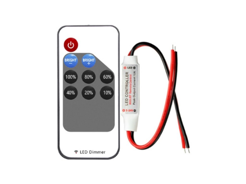 A fényerővezérlő modul távirányítóval DC5–24V rendszerekhez (pl. LED szalag, modul, spot, dekoráció) használható, akár 12A áramot is képes szabályozni. A 9 gombos távirányító akár 15 méteres hatótávval, gyors és kényelmes fényszabályozást tesz lehetővé.