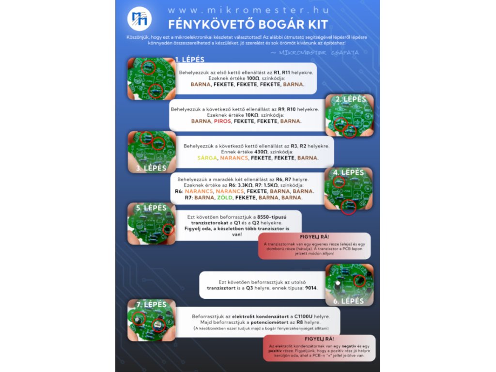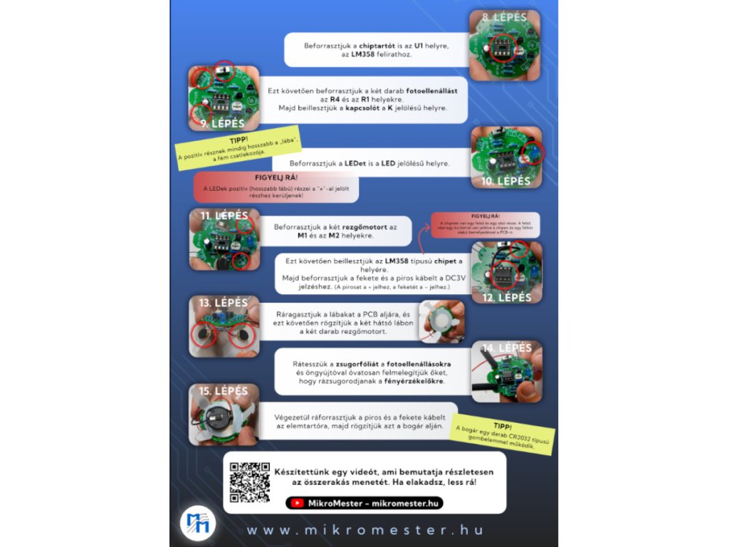 Az összeszereléshez forrasztópákára és forrasztóónra van szükség, amiket beszerezhetsz könnyen ITT. A DIY projekt során megismerheted a fényérzékelők, tranzisztorok, IC-k és mini vibrációs motorok működését, miközben játékos formában tanulod a robotika alapjait.