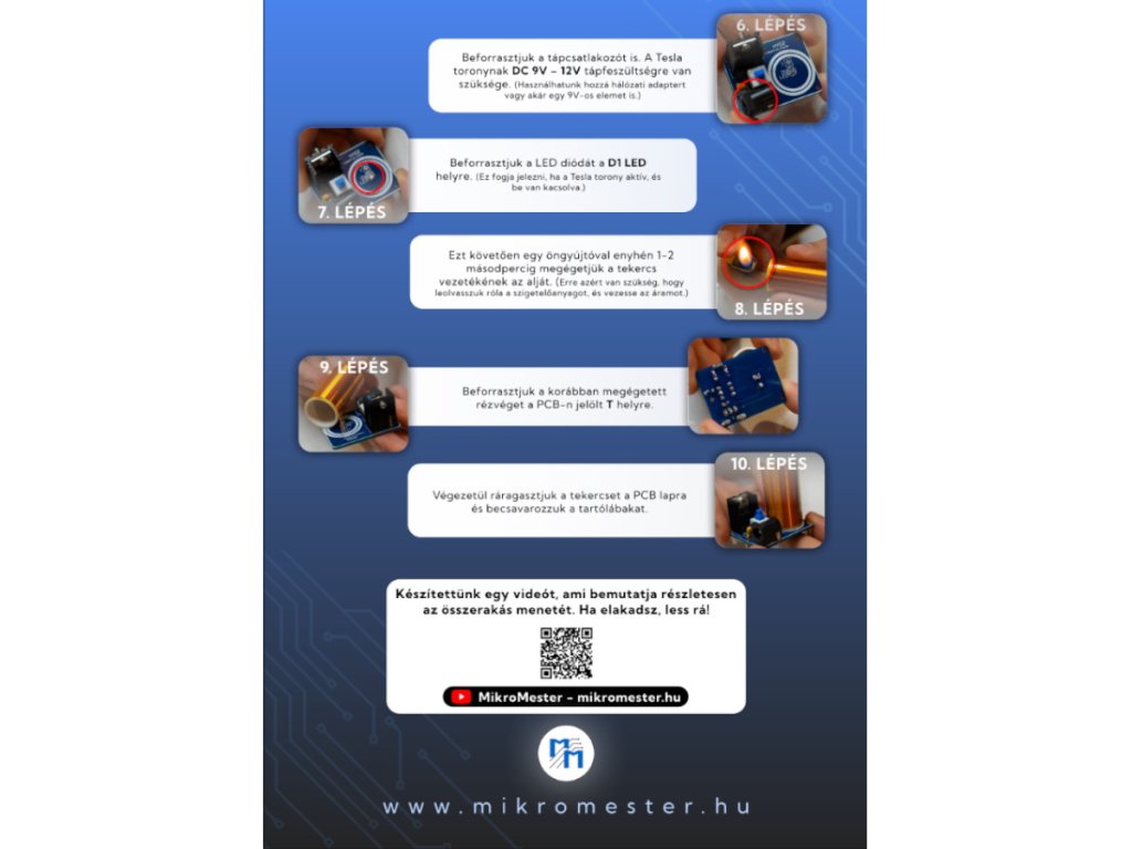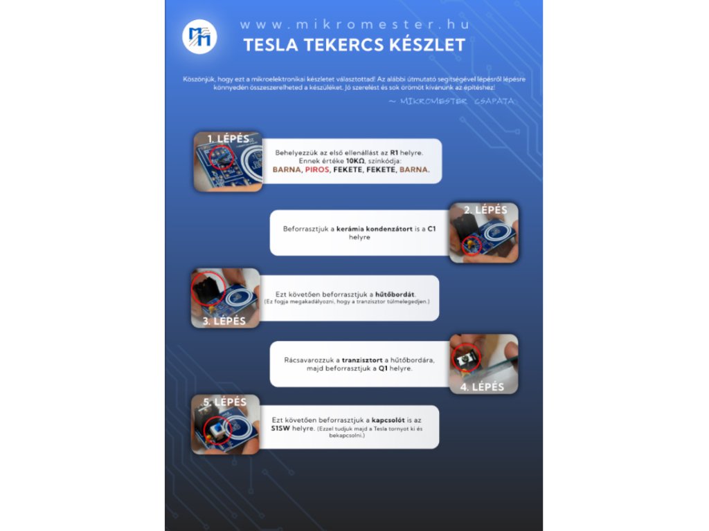 Az összeszereléshez forrasztópákára és forrasztóónra van szükséged, amit beszerezhetsz ITT. Megismerheted a tekercsek, kondenzátorok, tranzisztorok, LED-ek és egyéb alkatrészek helyes bekötését, miközben egy igazi működő Tesla tekercset raksz össze saját kezed munkájával!