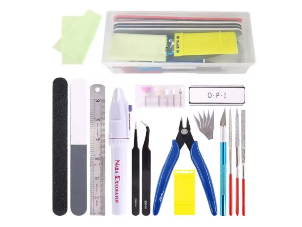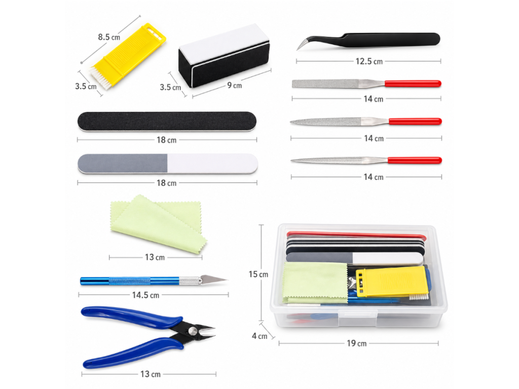 🧰 Mit tartalmaz a készlet?Többek között modellező kést, csípőfogót, csipeszeket, tűreszelőket, csiszolókat, tisztító kefét, tartalék pengéket, mini elektromos csiszoló eszközt és tárolódobozt.