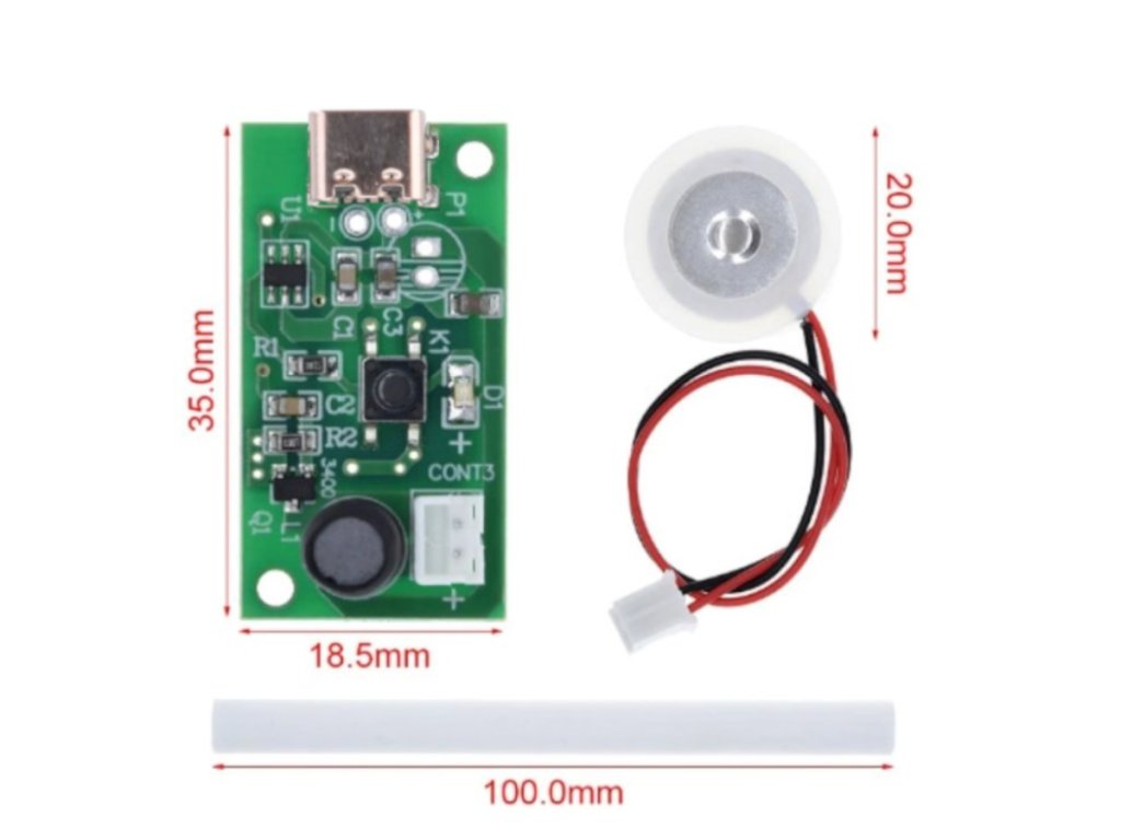 Ez a 5V-os, USB C-s párásító modul 2W teljesítménnyel és 300 mA áramfelvétellel, 110 kHz frekvencián működik. 8 cm hosszú vezetékkel egyszerűen csatlakoztatható, párologtató, levegőfrissítő és mini párásító eszközök olcsó, könnyen szerelhető alapeleme.