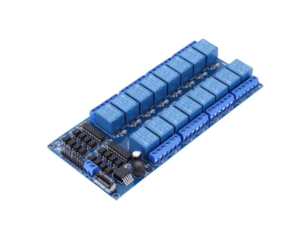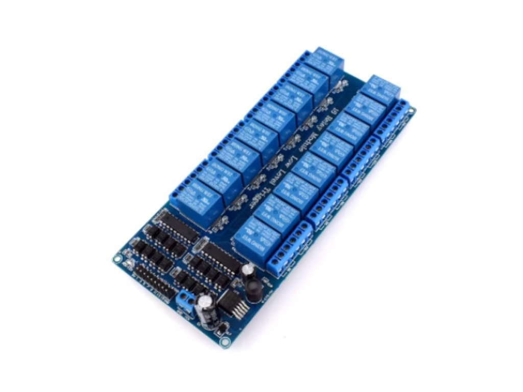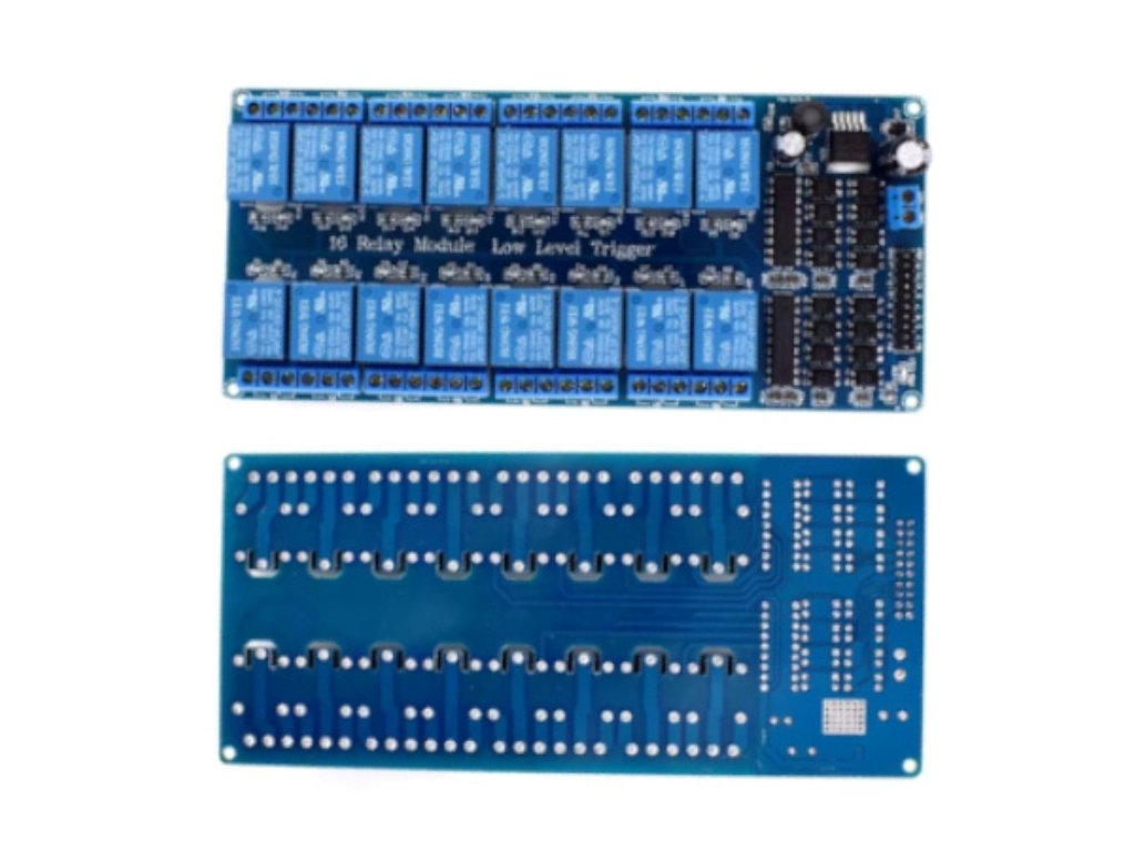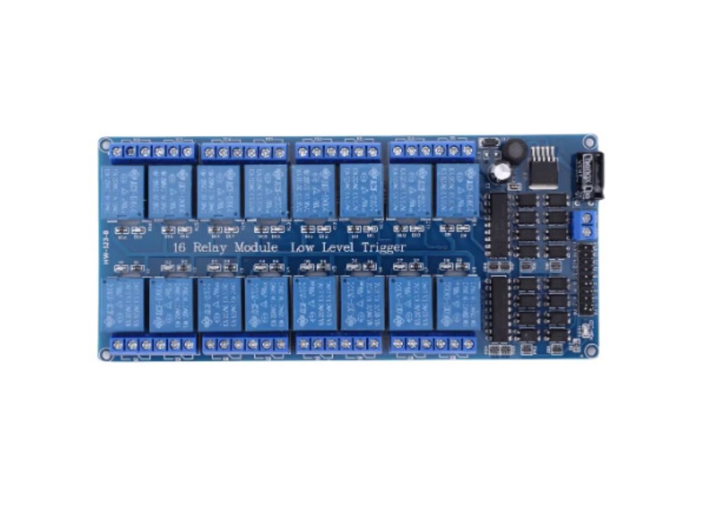 A 16 csatornás relé modul egy nagy kapacitású, több áramkör vezérlésére alkalmas egység, amelyet jellemzően mikrokontrolleres (Arduino, Raspberry Pi, ESP, PLC stb.) automatizálási, otthonvezérlési vagy ipari projektekhez alkalmaznak. Minden csatornához külön LED állapotjelző és nagy teljesítményű elektromechanikus relé tartozik.