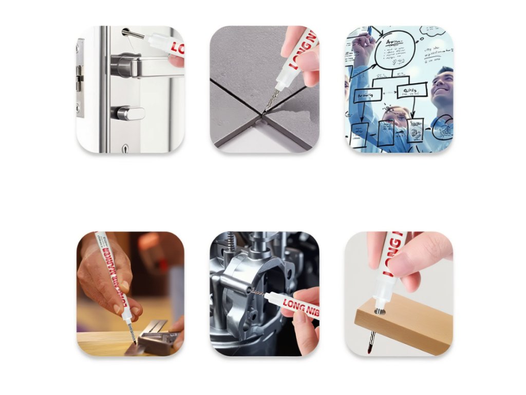 ✅ Minden felületen használható, ahol tartós, precíz és gyorsan száradó jelölésre van szükség (fa, fém, csempe, beton, műanyag)