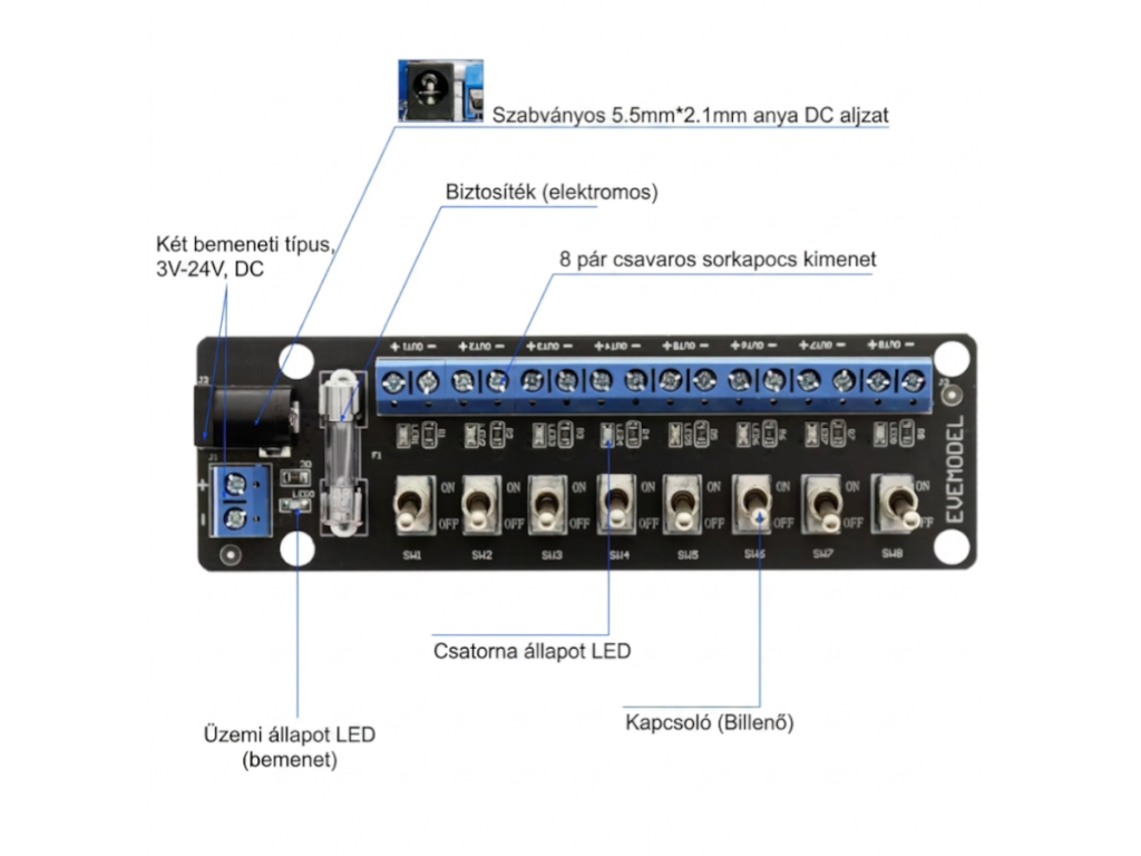 - Termék típusa: 8 csatornás DC tápelosztó modul kapcsolókkal