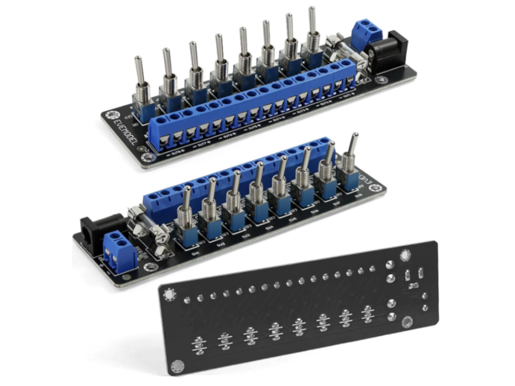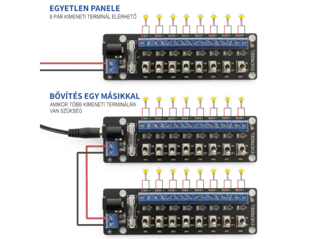 Ez a 8 csatornás tápelosztó modul praktikus megoldás modellvasút világítás, dioráma LED-ek, makett épületek és kis DC fogyasztók rendezett tápellátásához. A csatornák külön kapcsolóval vezérelhetők, így az egyes lámpák vagy világítási körök egymástól függetlenül ki- és bekapcsolhatók.