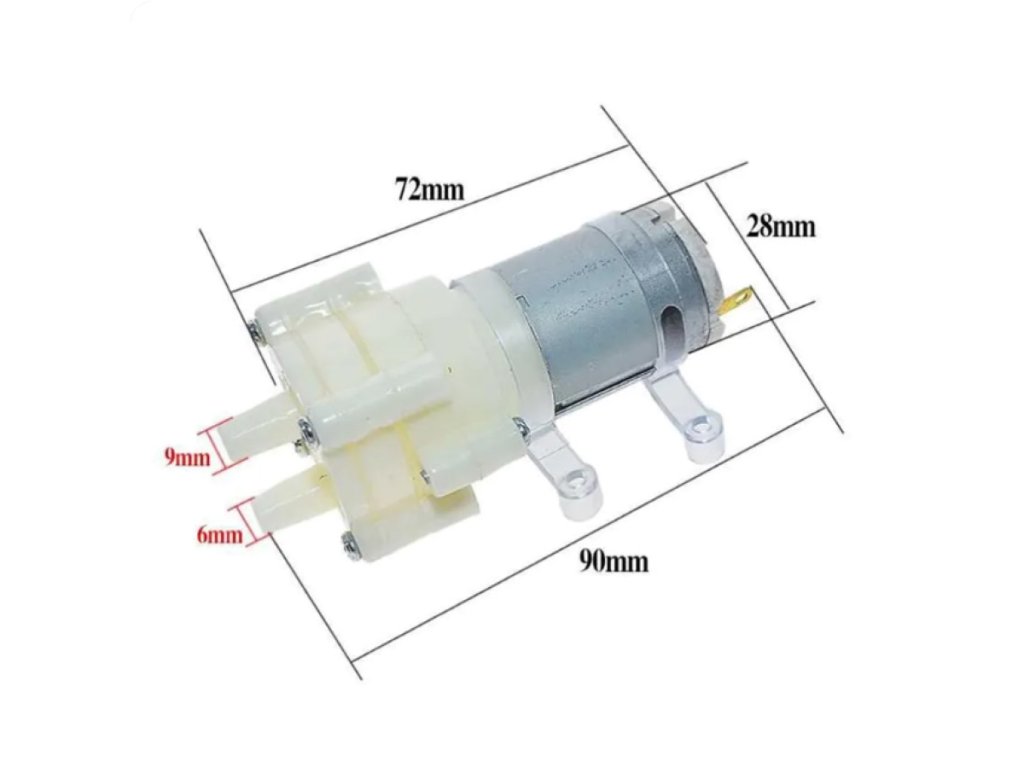 Ez a R365 típusú víz/levegő szivattyú 6–12 V DC tápfeszültséggel működik, áramfelvétele 350 mA. Víz emelési magassága maximum 1,2 m, maximális vízhőmérséklete 45 °C. Csőcsatlakozása 6–7 mm-es, szállítási kapacitása 1,5–2 l/perc. Mérete: 90 mm × 72 mm × 28 mm.